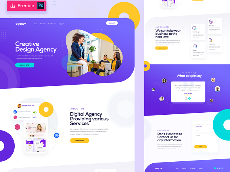Here’s a creative design agency template with a lively design and a youthful and dynamic color scheme. Thanks to Chirag Bactor for this PSD website template!